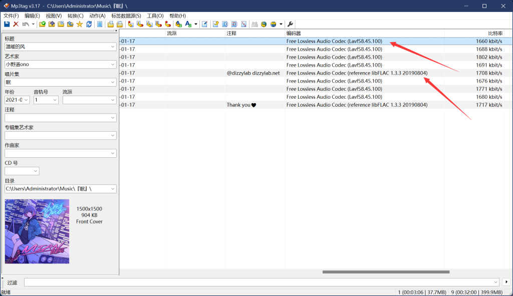 不过要注意的是,如果使用MP3TAG直接复制粘贴元数据会导致编码器内容同样被修改。这一点当初困扰了我很久,不过只要手动填一遍元数据即可√